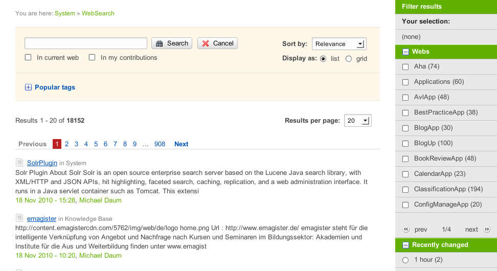 26 Sep 2019: performance improvements of indexer; implemented instant search; new crawler interface to index not only wiki content but also external sources; new filesystem crawler; eased configuring the search interface with preference variables; extended solr schema to cope with multiple data sources; improved handling of substring searches in text fields; require validation and authentication in rest handlers; removed hardcoded WorkflowPlugin support (plugins need to hook into the indexing api instead); added support for formfields of type number, percent, currency and bytes; improved indexing of used makros in a page; improved detection of outgoing links while indexing; changed handling of admin rights on content, i.e. not granting admin rights on external sources; improved autosuggestion dropdown search; added api to iterate over facet values while ignoring access rights