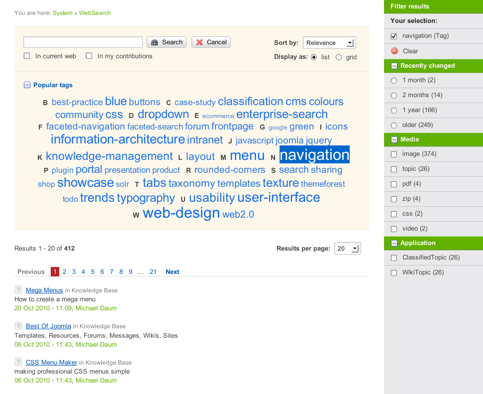 18 Oct 2015: fixed backwards compatibility with pre-unicode Foswiki; bring back solr::queryfields in SolrSearchBaseTemplate; fixed language facet to properly match language tags to their name; improved layout of search results as well as autosuggestion widget; removed workflow facet from default search; fixed icon mapping for topics that don't come with an icon defined in their TopicType; don't try to encode html entities without a code point in utf8; don't remove all macros from topic text, just some; removed dependency on MimeIconsPlugin as we are using fontawesome now; improved formula for sorting results by reference; fixed sorting in ajax-solr; fixed exposing/hiding parameters in ajax-solr; improved findability of content; i.e. when containing stop words only in the title; removed unused /browse search handler from solr config